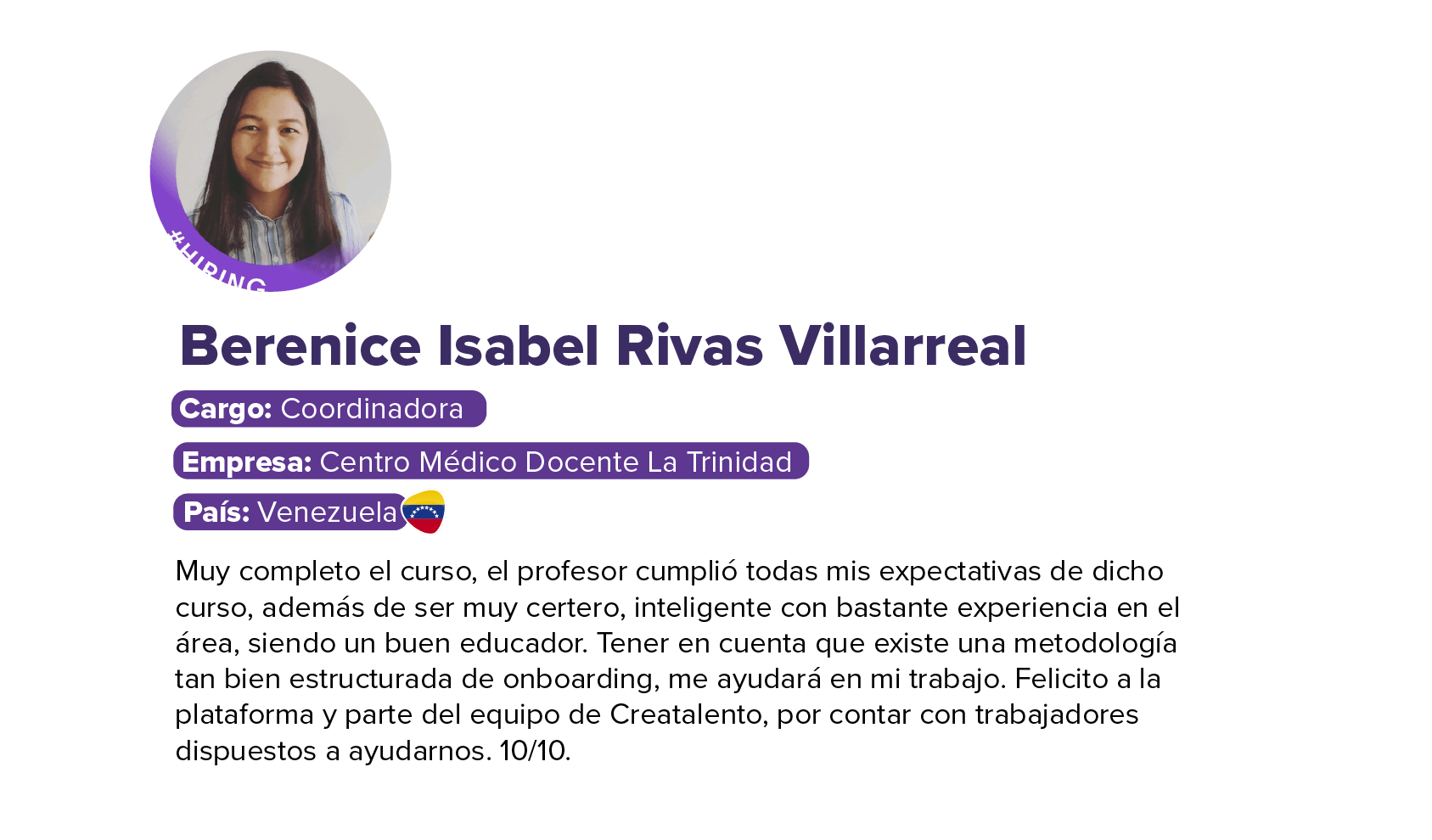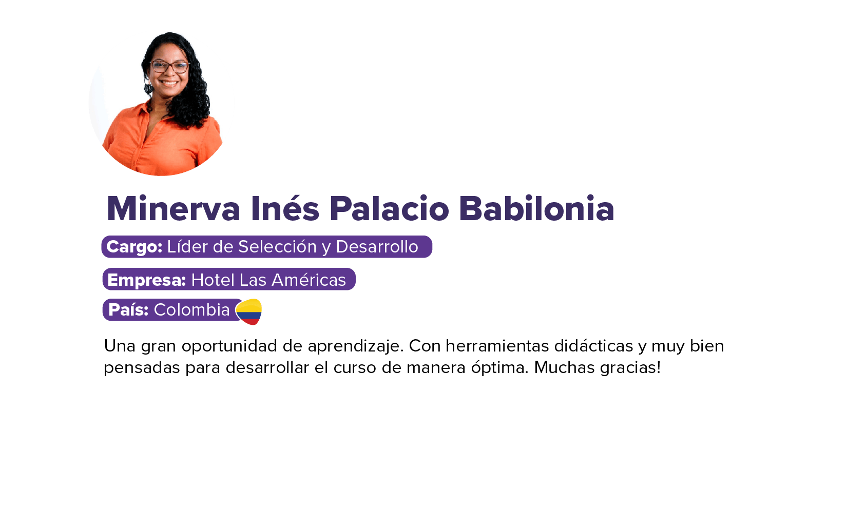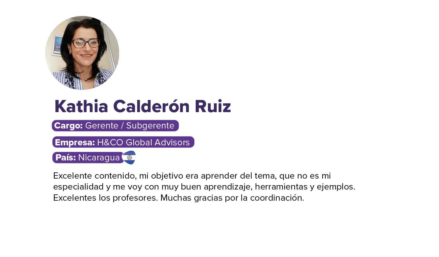 - Con más de 18 años de trayectoria liderando procesos de diagnóstico, diseño y desarrollo de iniciativas de capapacitación y aprendizaje.Se ha desempeñado como Subgerente y Gerente de Aprendizaje del Banco de Crédito del Perú - BCP, ha sido Gerente de Aprendizaje y Desarrollo de Backus, Director Asociado de Entrenamiento en Unique SA, lo que incluye la creación y desarrollo de equipos de Capacitación, Escuelas de Negocio y Universidades Corporativas, y Gerente Corporativo de Aprendizaje y Capacitación de Alicorp.